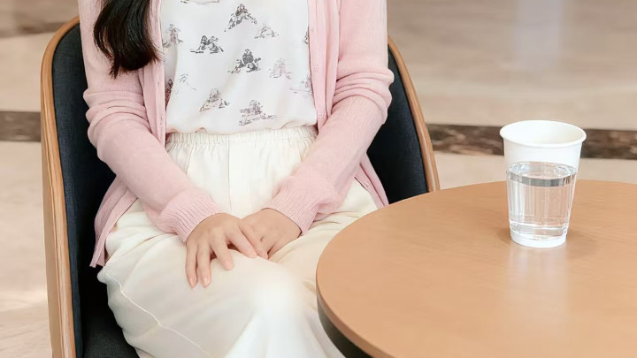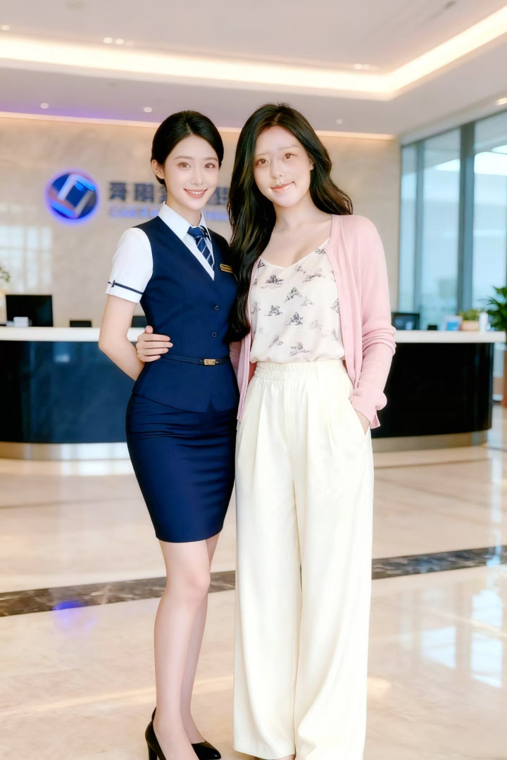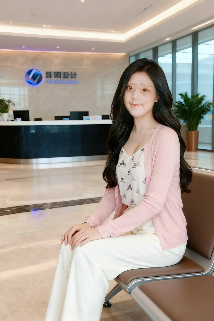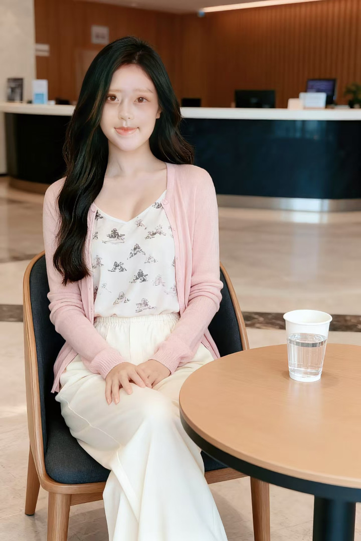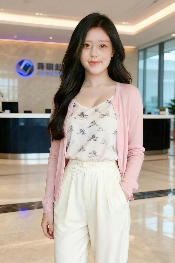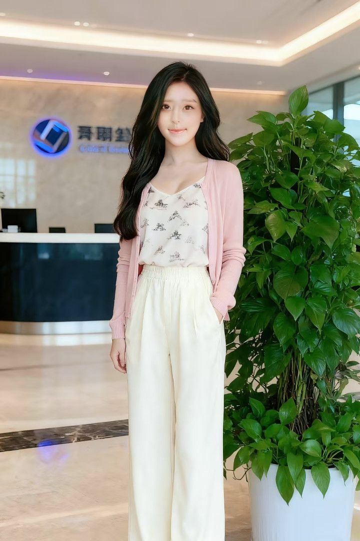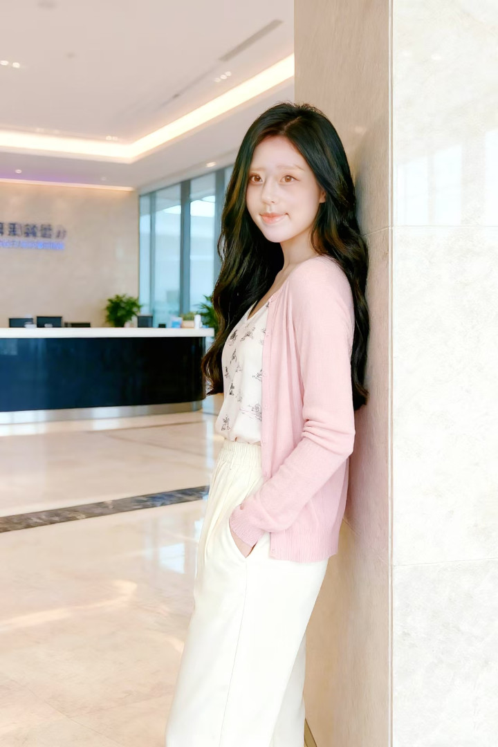 浅粉色的针织开衫,衣身轻薄柔软,长袖设计贴合手臂线条;内搭印有卡通图案的白色吊带背心,图案精致可爱,造型增添了活泼感;下装搭配一条米白色的宽松长裤,裤型利落且带有细腻纹理,裤腰处的松紧设计贴合身形;整体穿搭简约清新,尽显休闲舒适的风格。